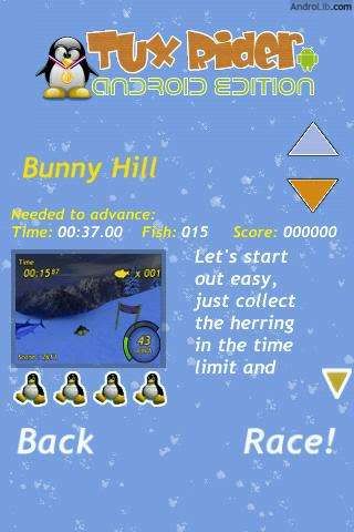Control penguin Tux, riding down a snow slope, with either accelerometer, trackball or dpad.