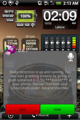 ShootMe allows you to take screenshots of your device. Just fire up ShootMe and give a good sustained (> 0,5s) shake or shout to take a screenshot. Only supports devices. Validated on Dream, Magic, Hero, Galaxy, Spica, Liquid. ShootMe (Screen Grabber) was developed for Android by Johan Cloetens Package name : com.bw.picme.local