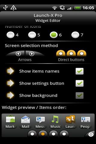Launch-X is a powerful widget for your homescreen, that gives you quick-access to your favorite apps and contacts!The widget takes a single horizontal row on your screen (4x1), but you can fill it with much more than the standard 4 icons.